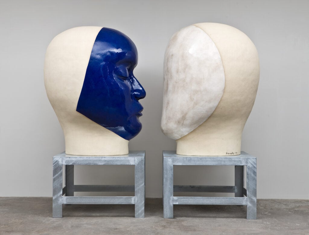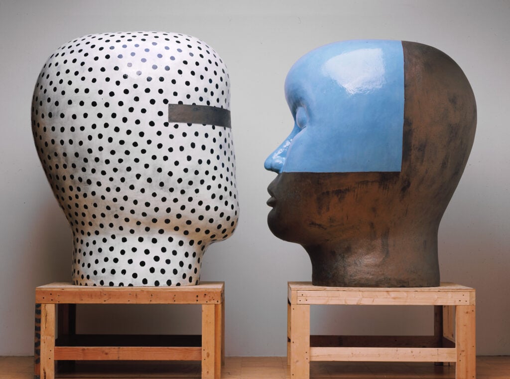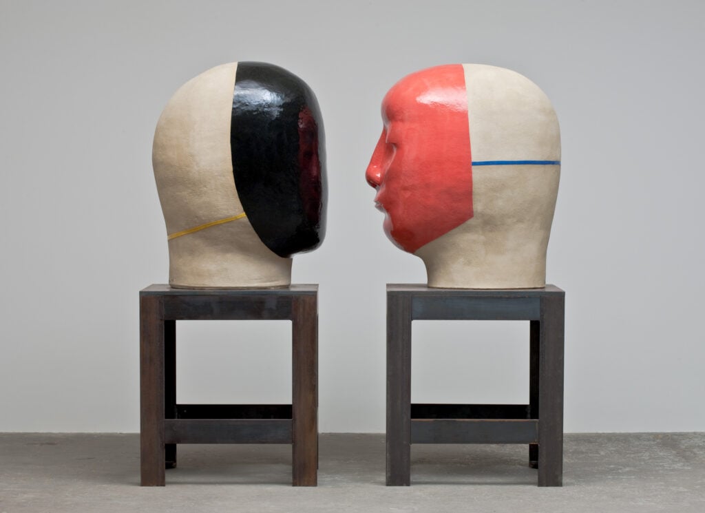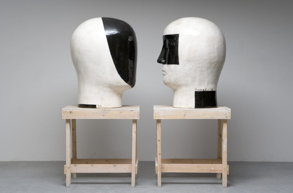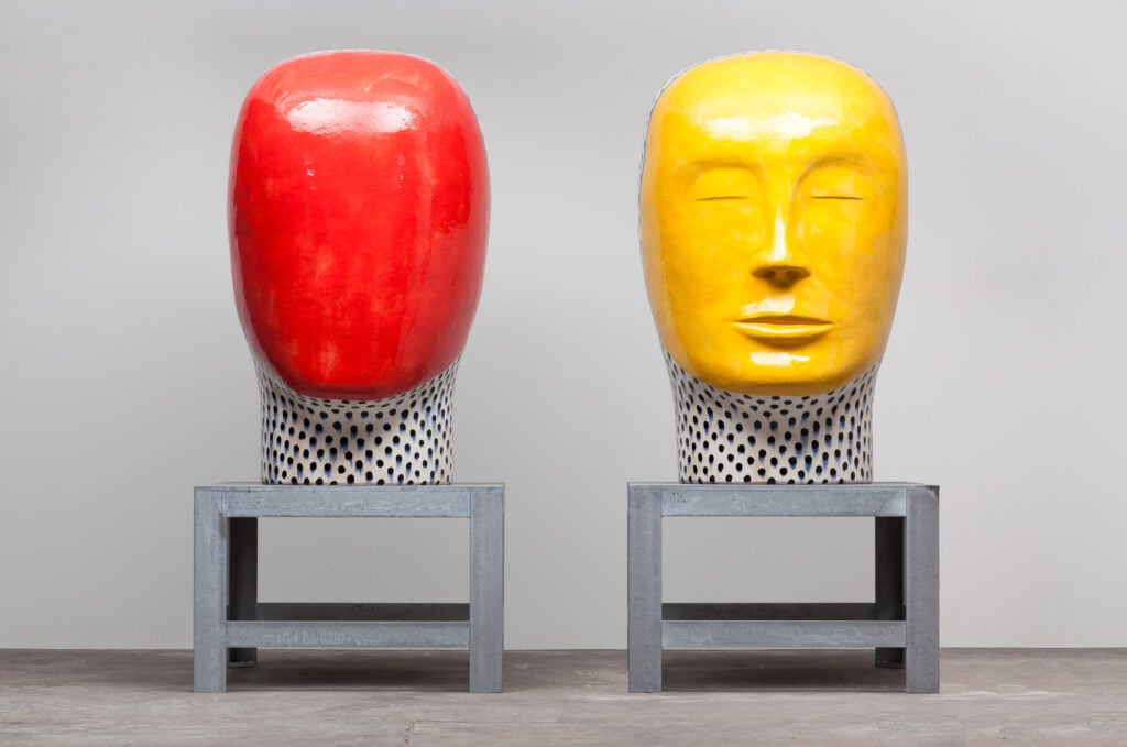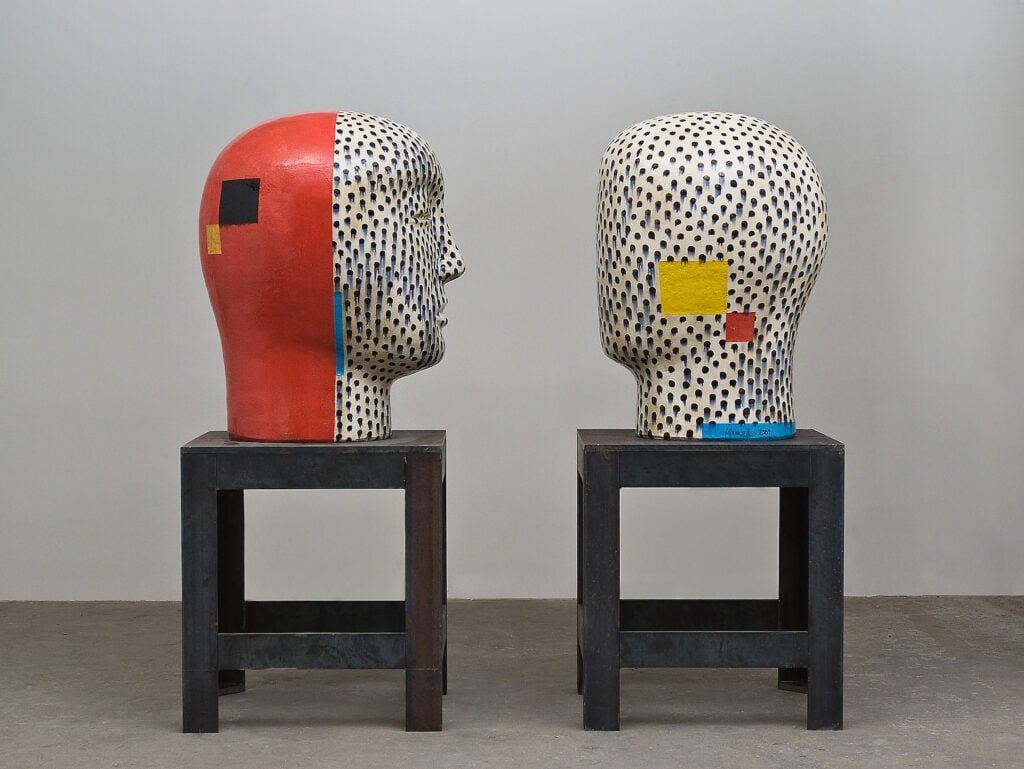 Jun Kaneko first thought about experimenting with the human head as a sculptural form quite early in his career, but only began making them in 1993. He has long had an interest in the human figure as an abstract shape. Kaneko believes that seeing something familiar shrinks the distance between observer and object. He says, “There are lots of possibilities to the problem of abstract form and the head. To shrink the distance between viewer and object by using a realistic form or head interests me greatly. I started making heads as a pair, because it gives me the opportunity to create a different visual power. The space between the two in the pair is the important element.”