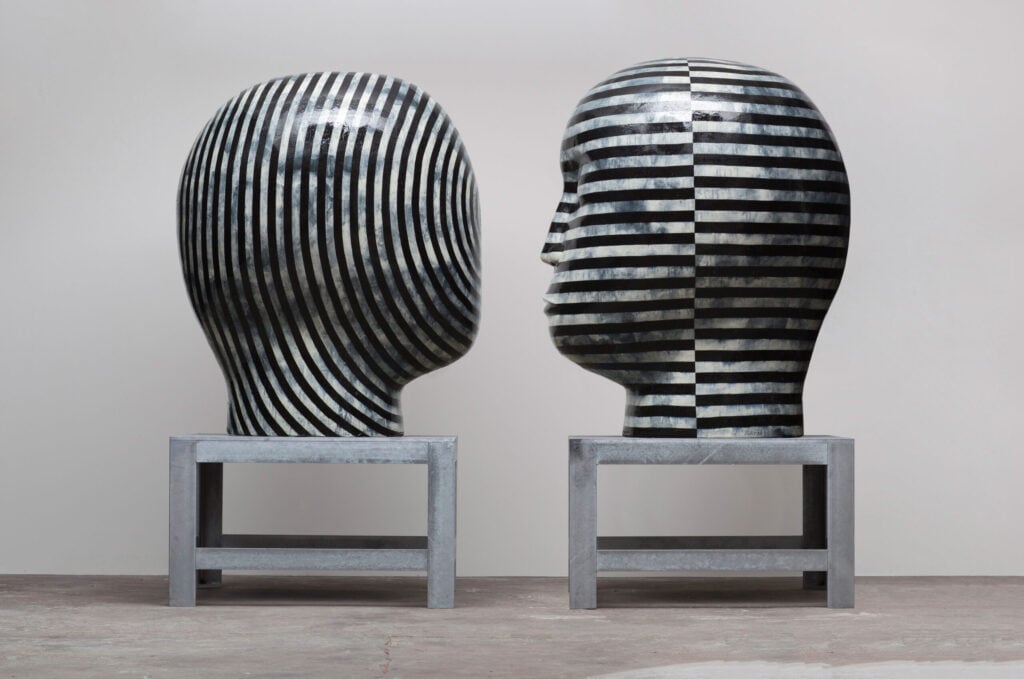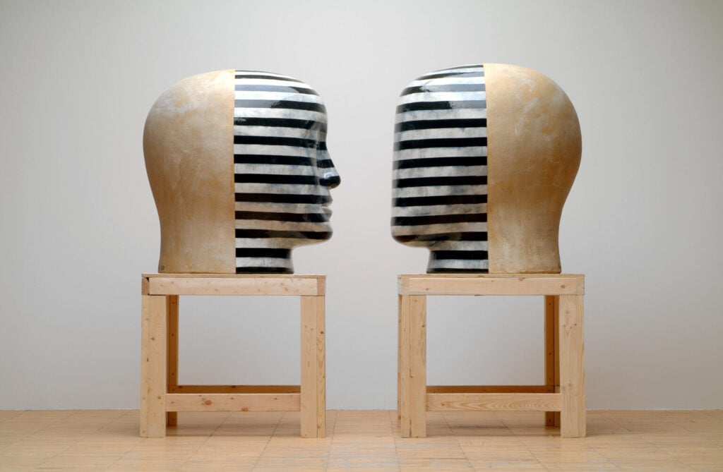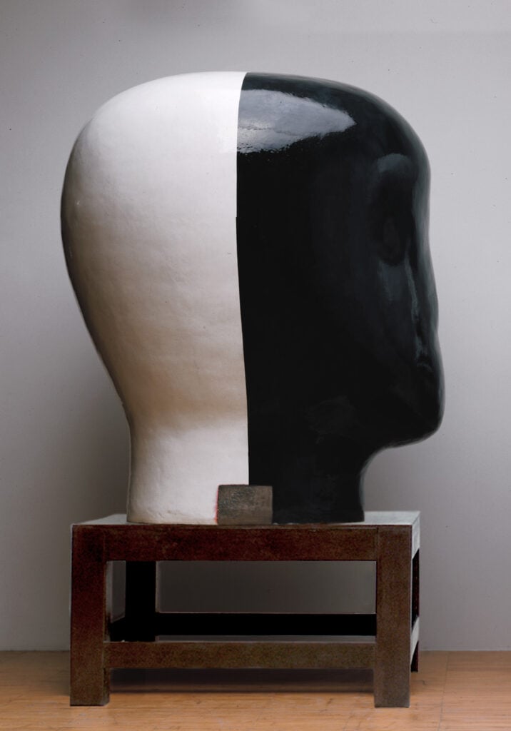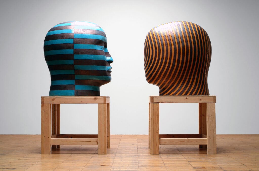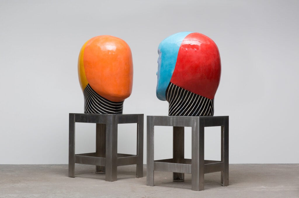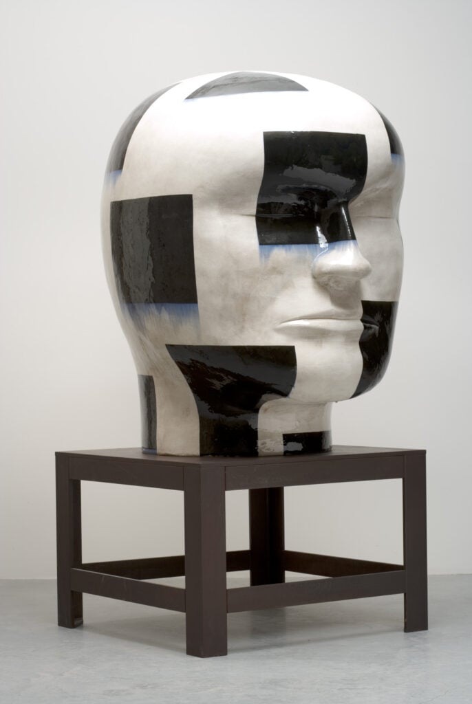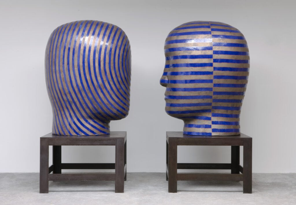 Jun Kaneko first thought about experimenting with the human head as a sculptural form quite early in his career, but only began making them in 1993. He has long had an interest in the human figure as an abstract shape. Kaneko believes that seeing something familiar shrinks the distance between observer and object. He says, “There are lots of possibilities to the problem of abstract form and the head. To shrink the distance between viewer and object by using a realistic form or head interests me greatly. I started making heads as a pair, because it gives me the opportunity to create a different visual power. The space between the two in the pair is the important element.”