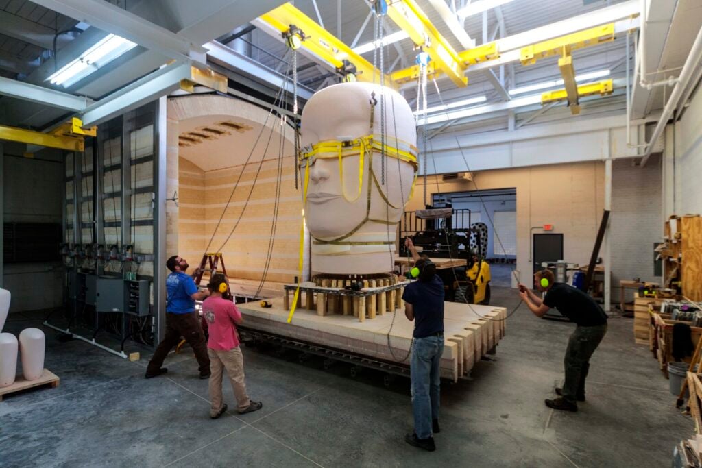 Assistants unload a bisque-fired Head from kiln