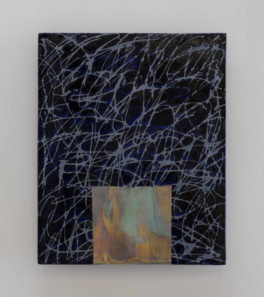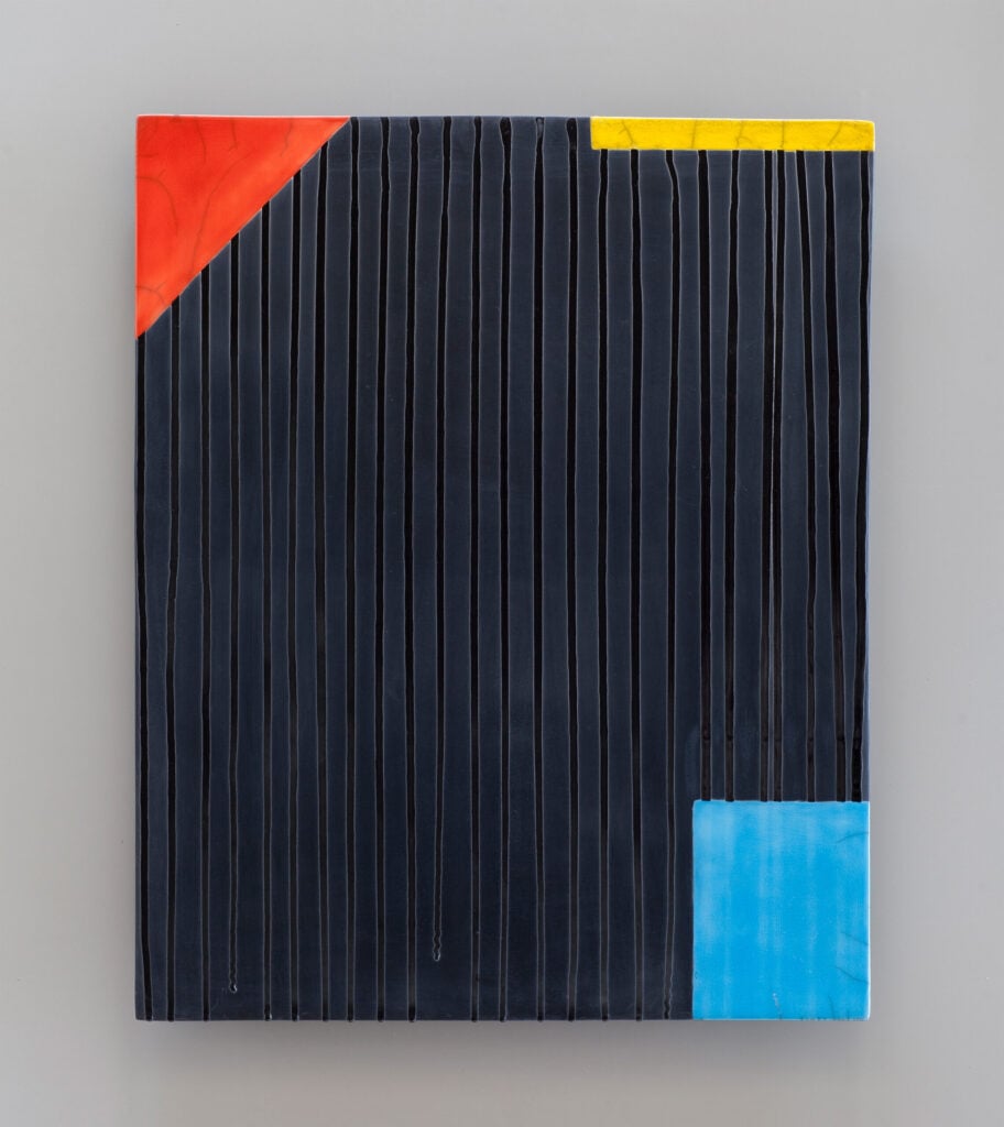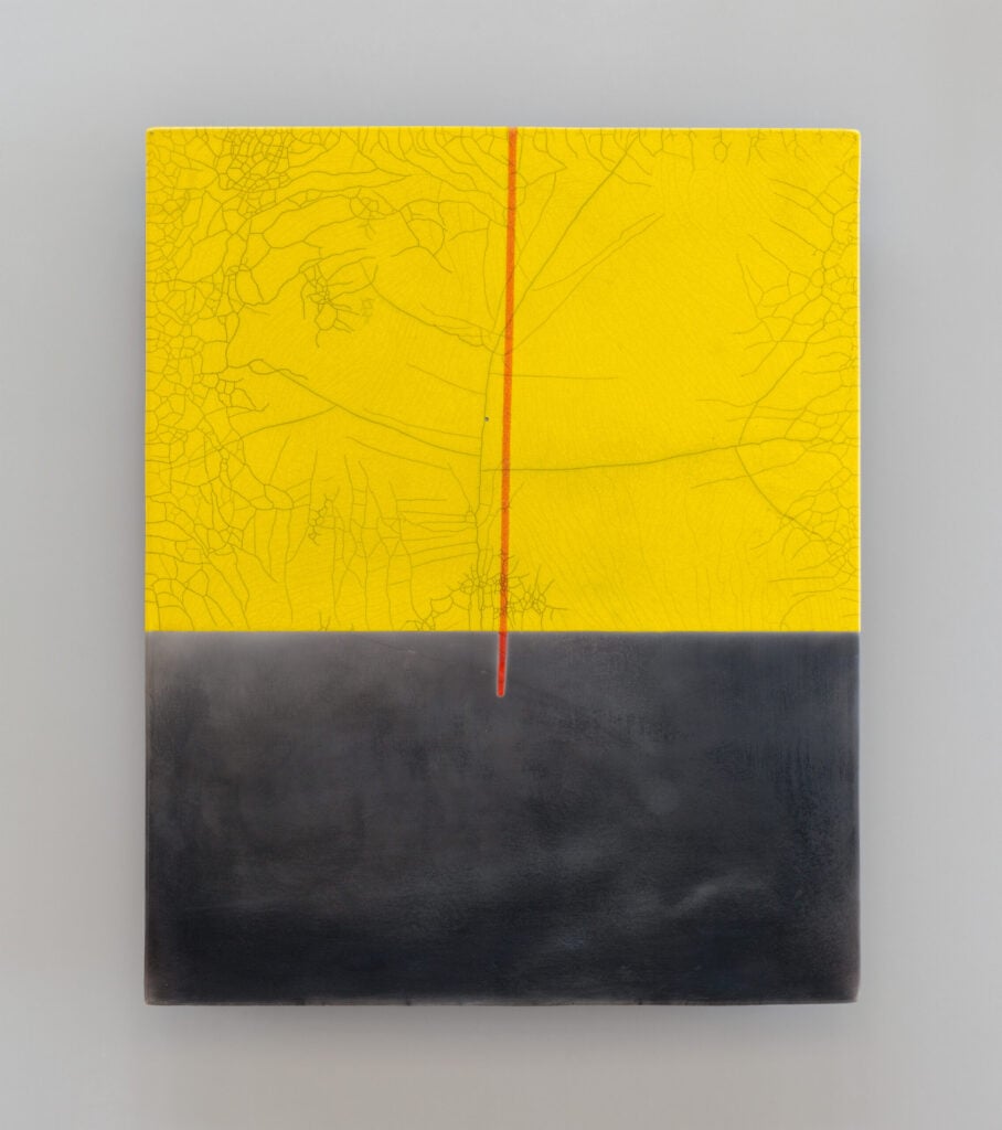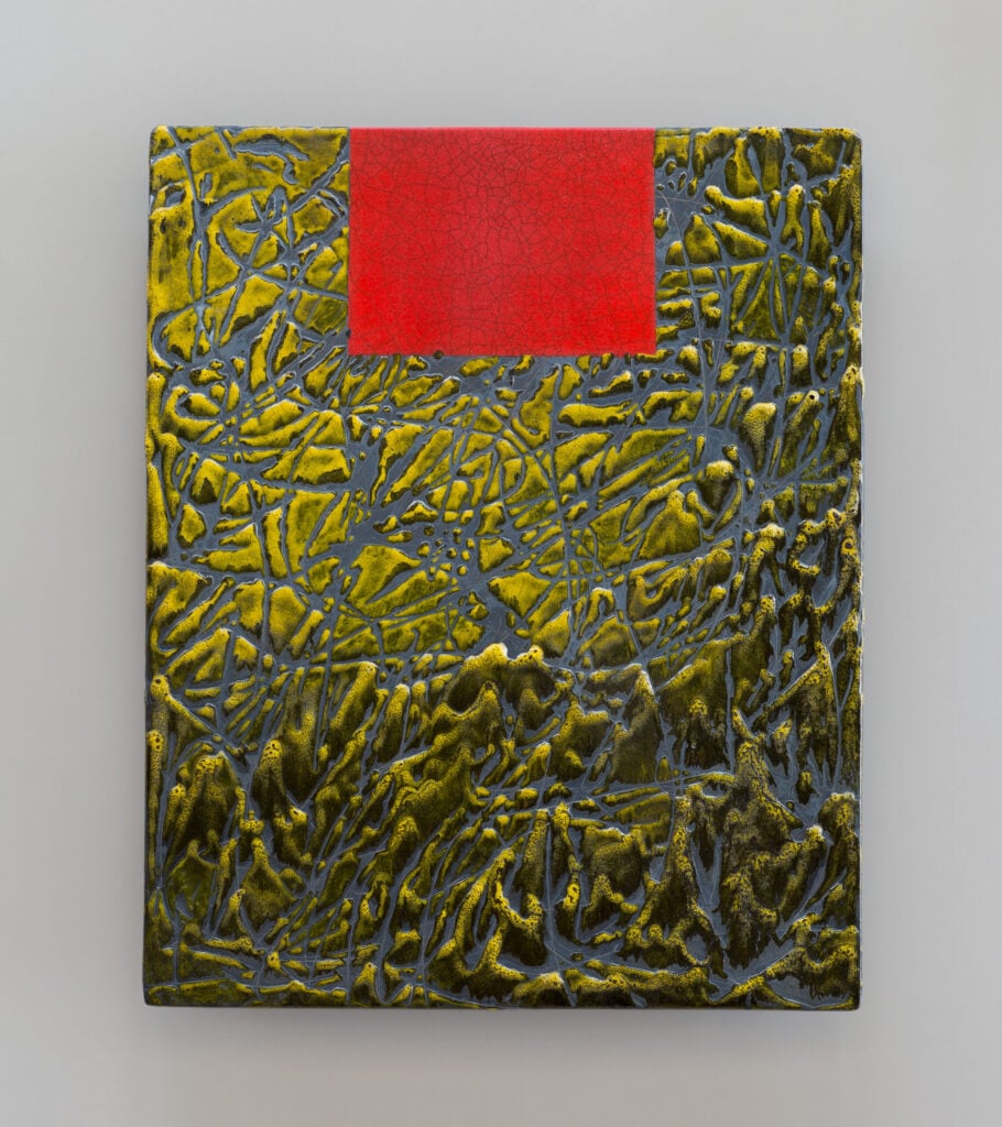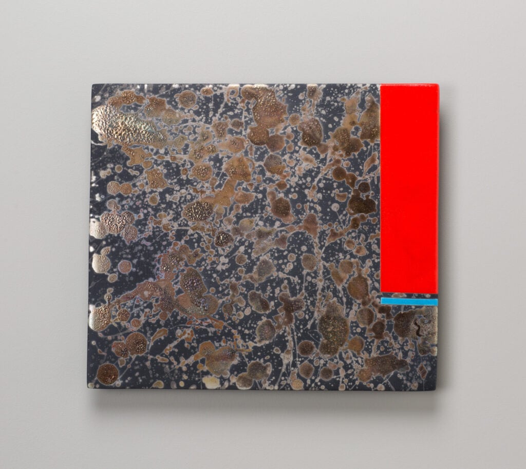 Hand glazed raku ceramics, 30.5 x 24.5 x 1.5 inches Private collection.