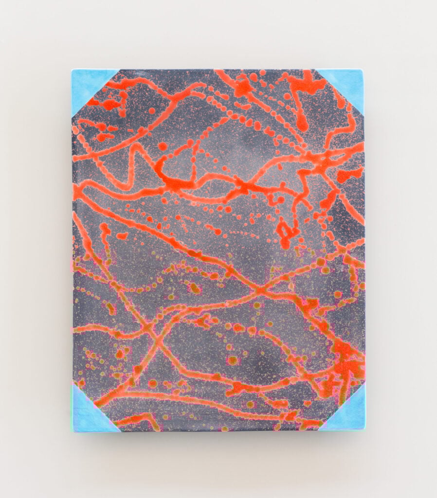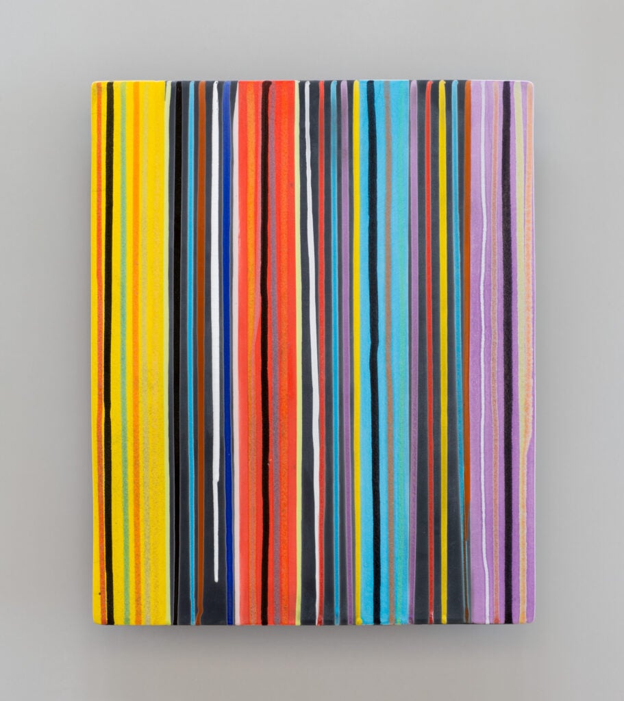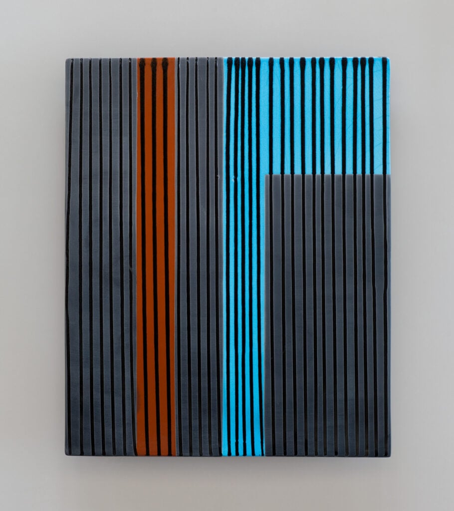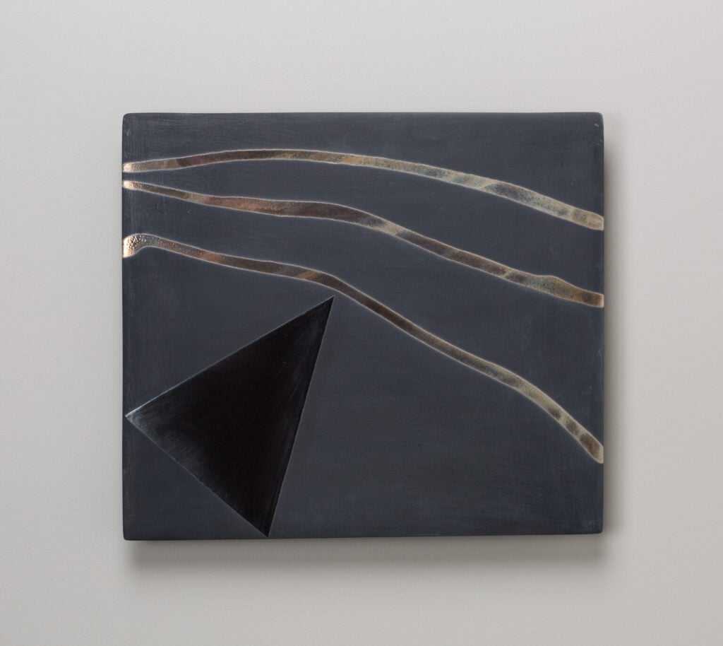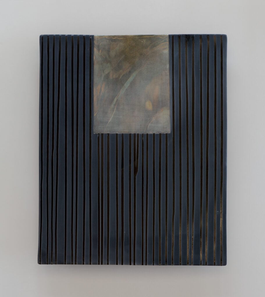 Hand glazed raku ceramics, 30.5 x 24.5 x 1.5 inches Private collection.