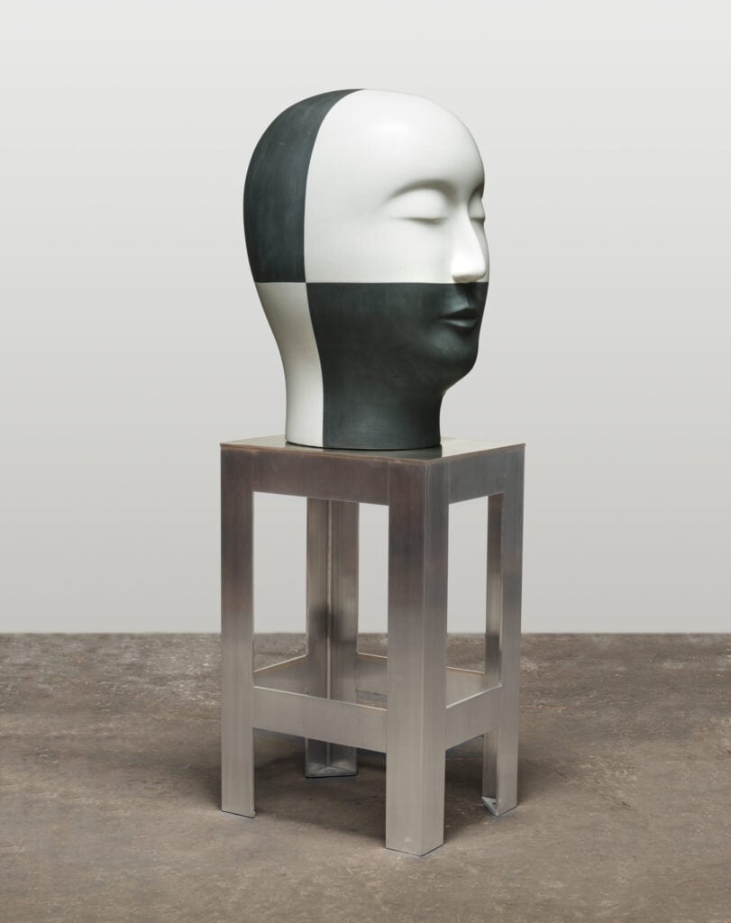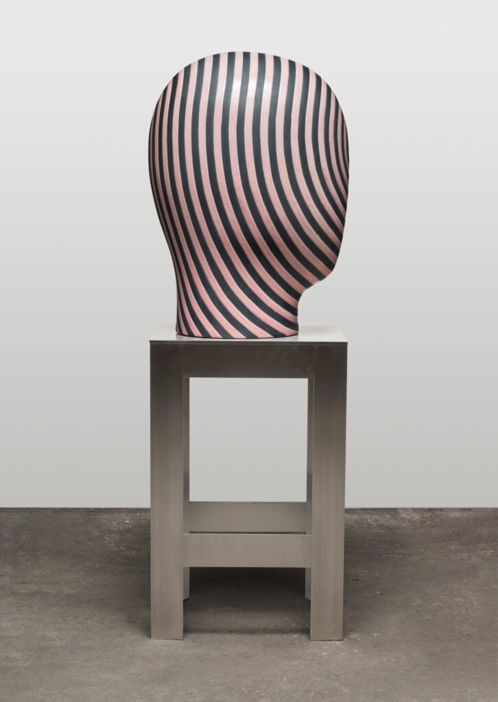 Hand glazed cast raku ceramics and stainless steel, 69 x 24.75 x 20 inches. Private collection.